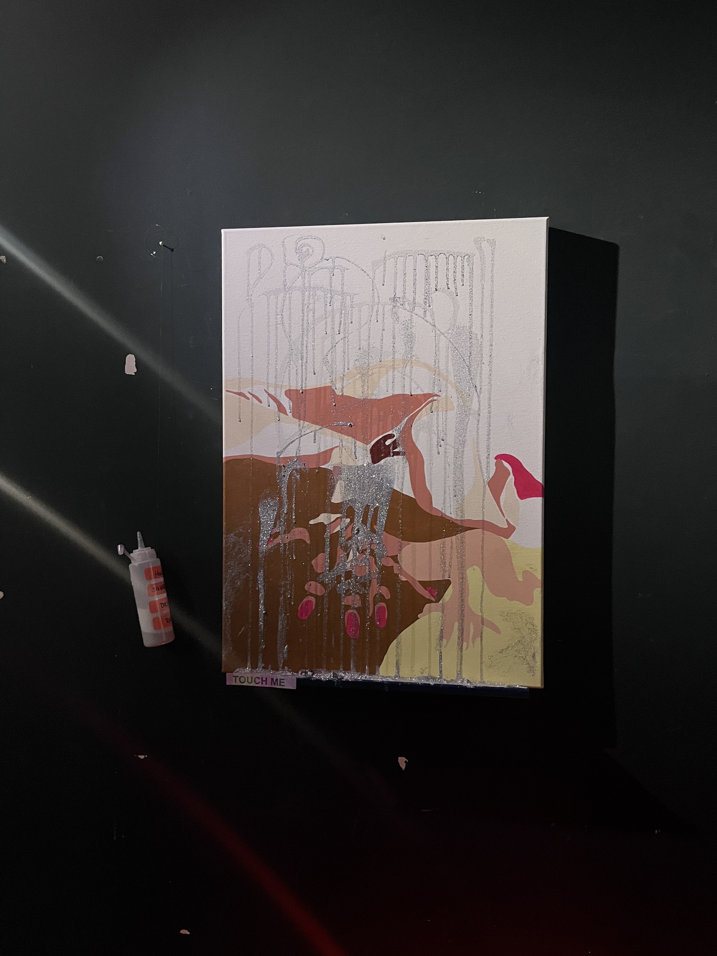 Guests were invited to interact, using multicolored glitter to physically alter the paintings. What began as exposure became a shared act of transformation — a conversation between touch and vulnerability.