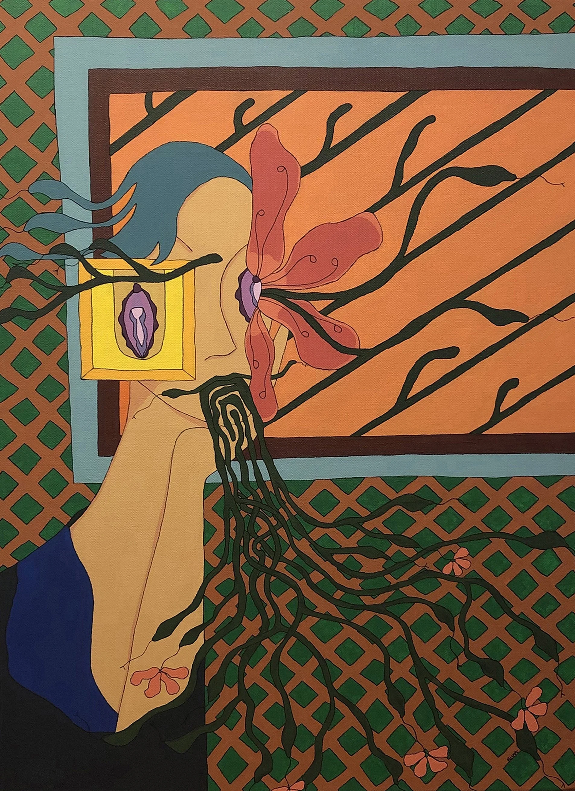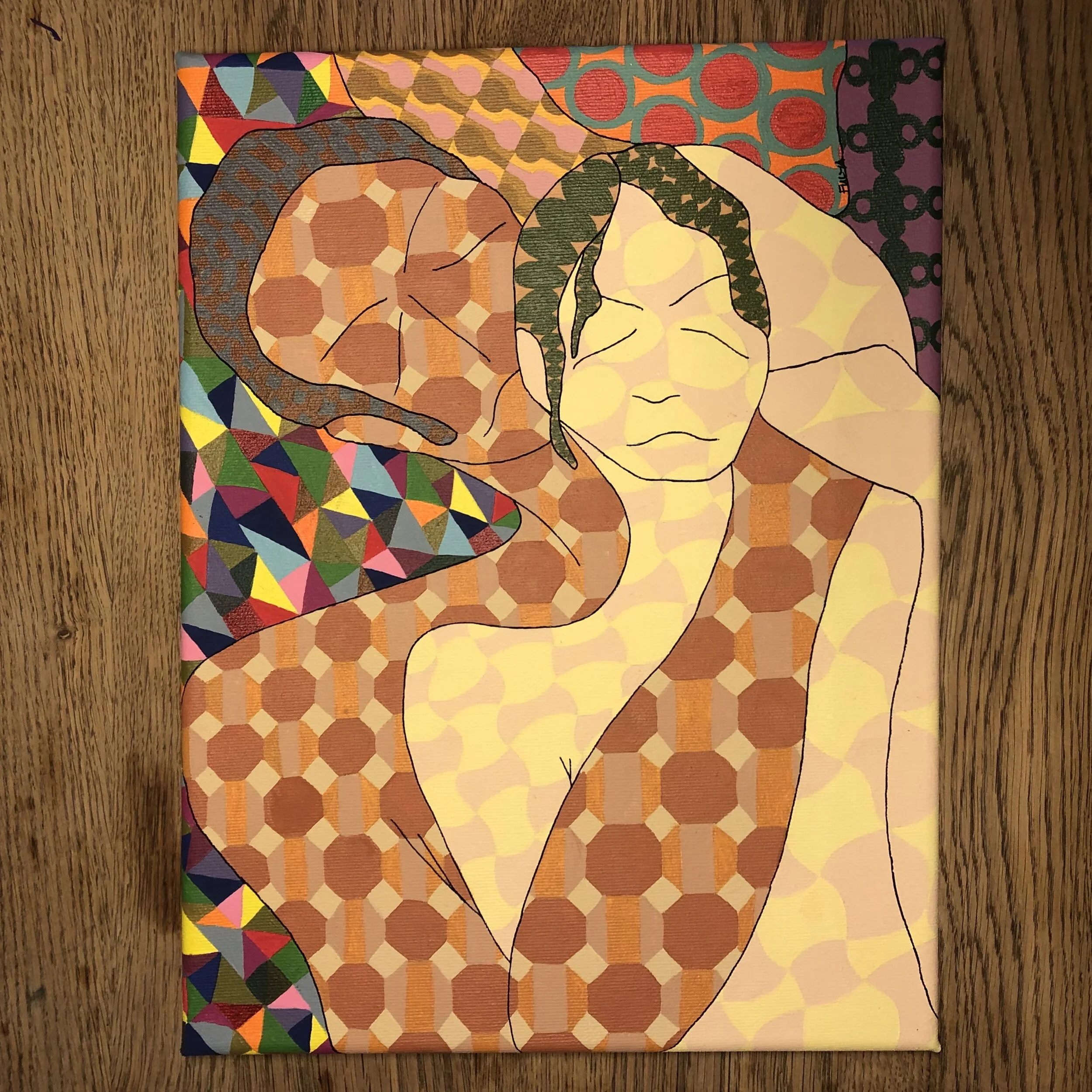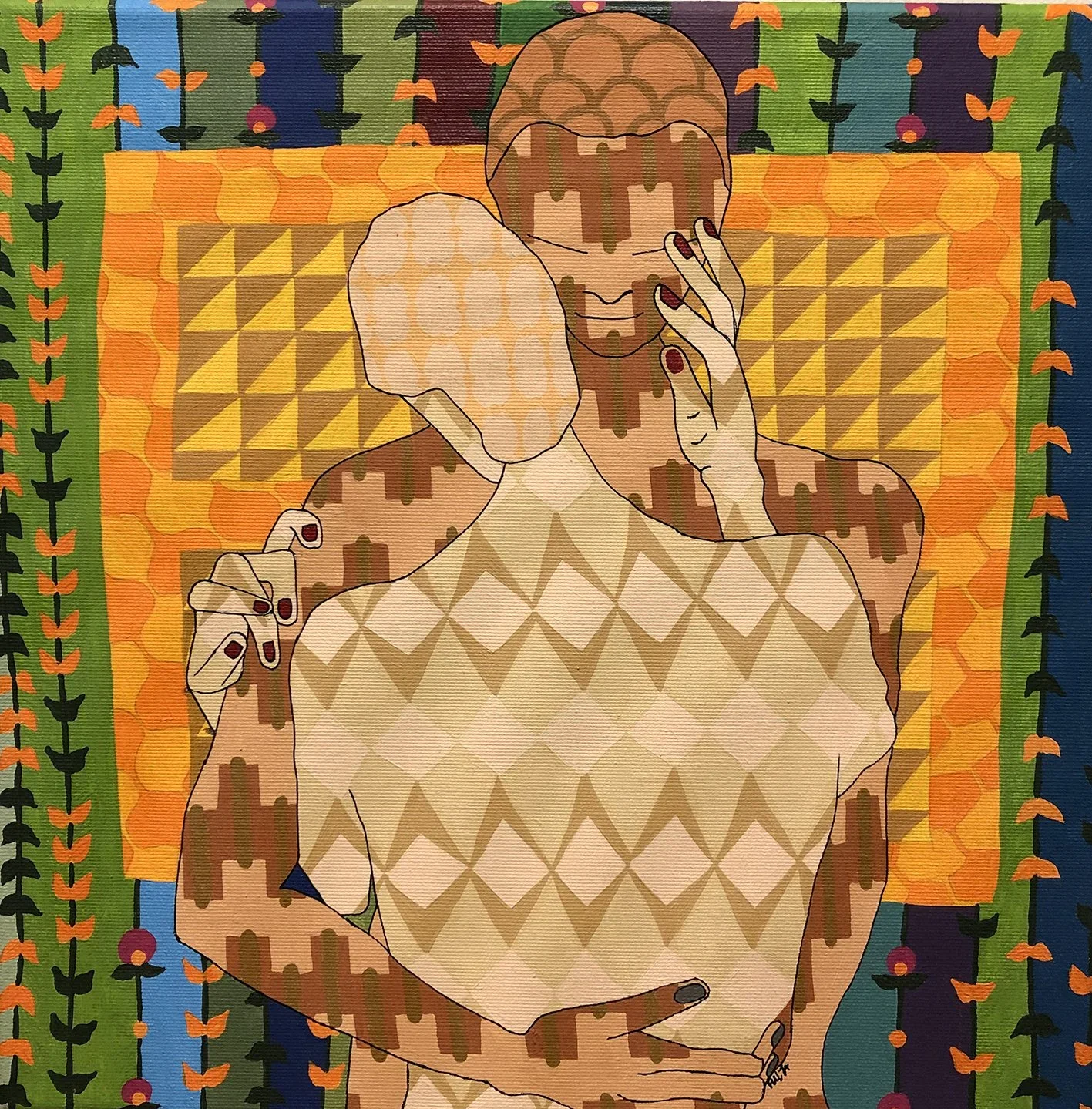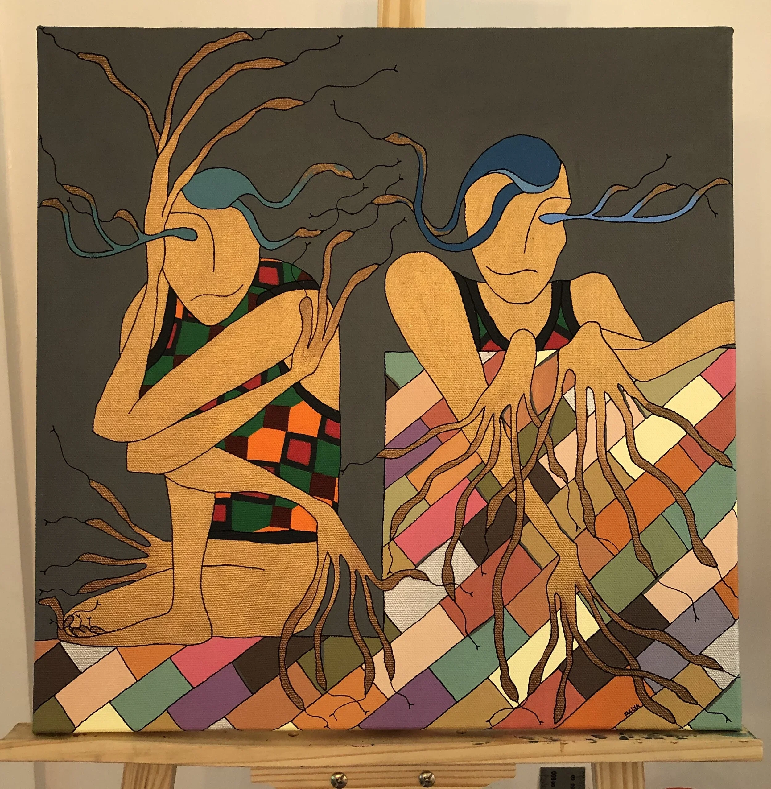Each painting presented the human figure in transformation roots extending, patterns dissolving, bodies merging and re-emerging. The work spoke to the organic complexity of being: how we absorb and reflect the worlds we inhabit, how intimacy leaves traces, and how boundaries between self and other blur.